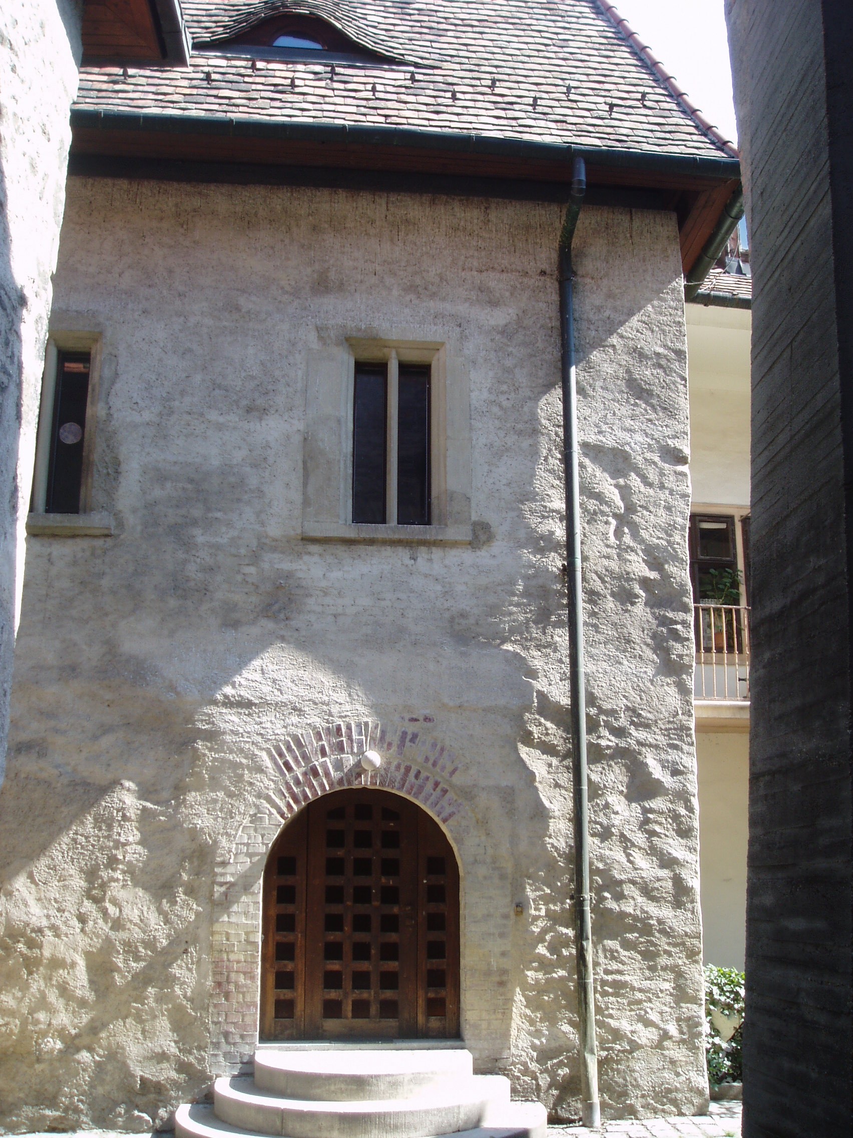 Nyilvános 943 | 1245 | Sopron, Új utca 11. | A középkori eredetű lakóház középkori zsinagógát rejt. Az első zsidók a XIII. században települtek be Sopronba. 1370 körül épült ez az imaházuk, egy Izrael nevű bankár magánzsinagógájaként. A többször átalakított épület egyszerű barokk homlokzatának bal oldalán nyílik a kosáríves kapuzat, amelyen át beléphetünk a középkori templomba: elsőként egy utcára nyíló, boltozatos terembe, majd innét magába a zsinagógába. A képen a boltozatos terem bejárata látható. A kép 2008 júniusában készült. Felh. irod.: Czellár Katalin: Sopron. 3. jav. kiad. Bp. Panoráma, 2000 |