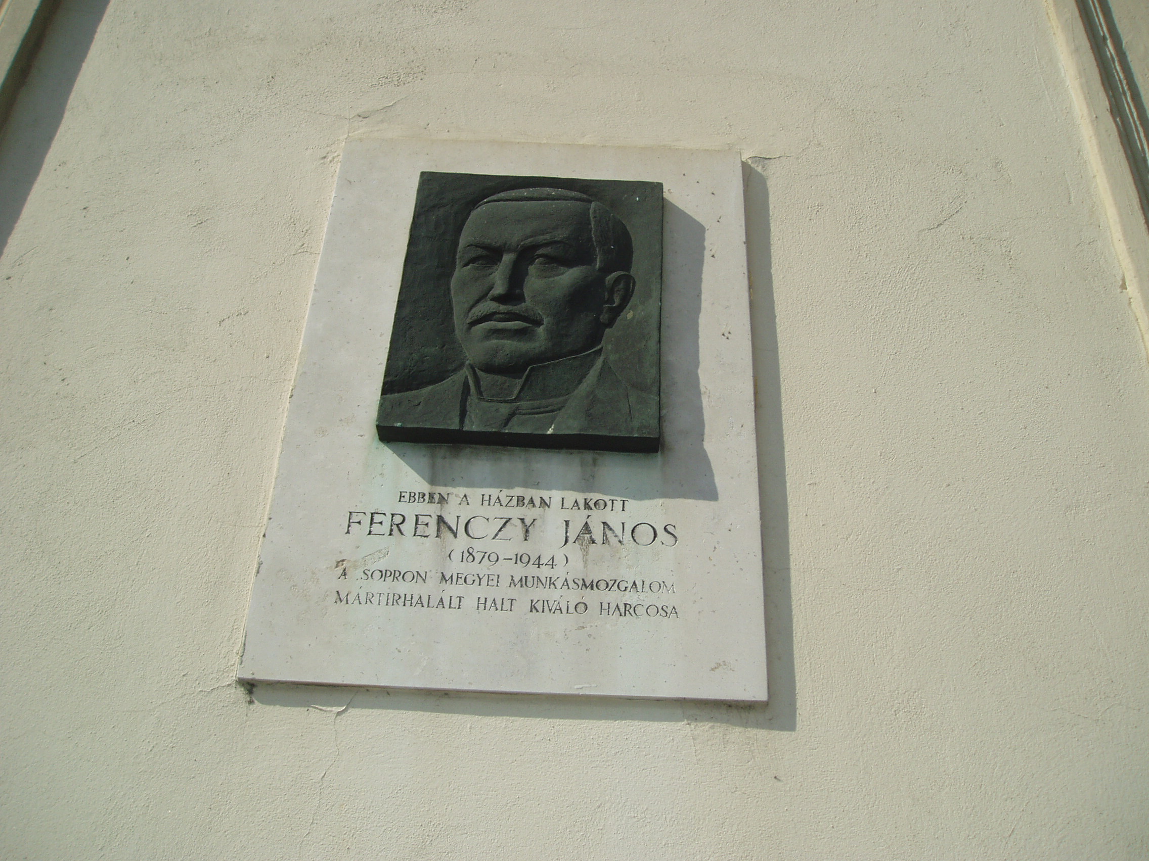 Nyilvános 937 | 1281 | Sopron, Újteleki utca 54. | Az épületen domborműves tábla idézi Ferenczy János (1870-1944) alakját. Egykor ebben a házban lakott a sopron megyei munkásmozgalom mártírhalált halt kiváló harcosa. A kép 2008 júniusában készült. |