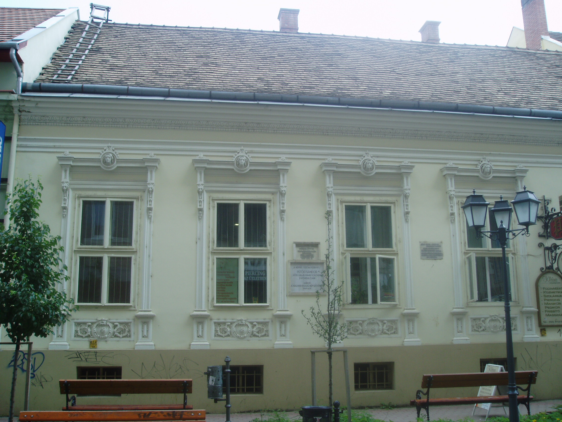 Nyilvános 1411 | 3433 | Debrecen, Batthyány utca 16. | Ebben a házban lakott Petőfi Sándor gyermeküket váró fiatal feleségével 1848/49 telén, Ormós Gábor szabómesteréknél. Itt született meg 1848. december 15-én fia, Zoltán. A nagy eseményről a költő így számolt be: "Született Zoltán fiam december 15-én 1848. déli tizenkét órakor, Debrecenben, a Harmincad utcában, az utcára nyíló kapu melletti szobában... Azaz jobban mondva: pénteki napon és ami több, Debrecenben!" Visszagondolva 1843/44 telére, amit rendkívül nyomorúságos körülmények között töltött Debrecenben, nem csoda, hogy a város nem a legjobb emlékeket hagyta a költőben. A szobában, amely az utcára nyíló kapu mellett található, ma utazási iroda van... Petőfi harcra buzdító, nagyhatású költemények egész sorát írta ebben a házban: Akasszátok fel a királyokat, Itt a nyilam, mibe lőjem, Az egész világ a harcmezőn, Európa csendes, újra csendes... és más költeményeit. Innen indult a harctérre, Bem tábornokhoz, hogy aztán már csak egy-egy napra, futó látogatásra térjen vissza családja körébe A ház homlokzatán több emléktábla is idézi az történteket. A fénykép 2006 júniusában készült. Felh. irod.: Kovács Gergelyné: Debrecen. Bp. Panoráma, 1981 Papp Antal: Debrecen. Bp. Panoráma, 1976 Petőfi emlékhelyek a Kárpát-medencében. Kiskőrös, 1996 |