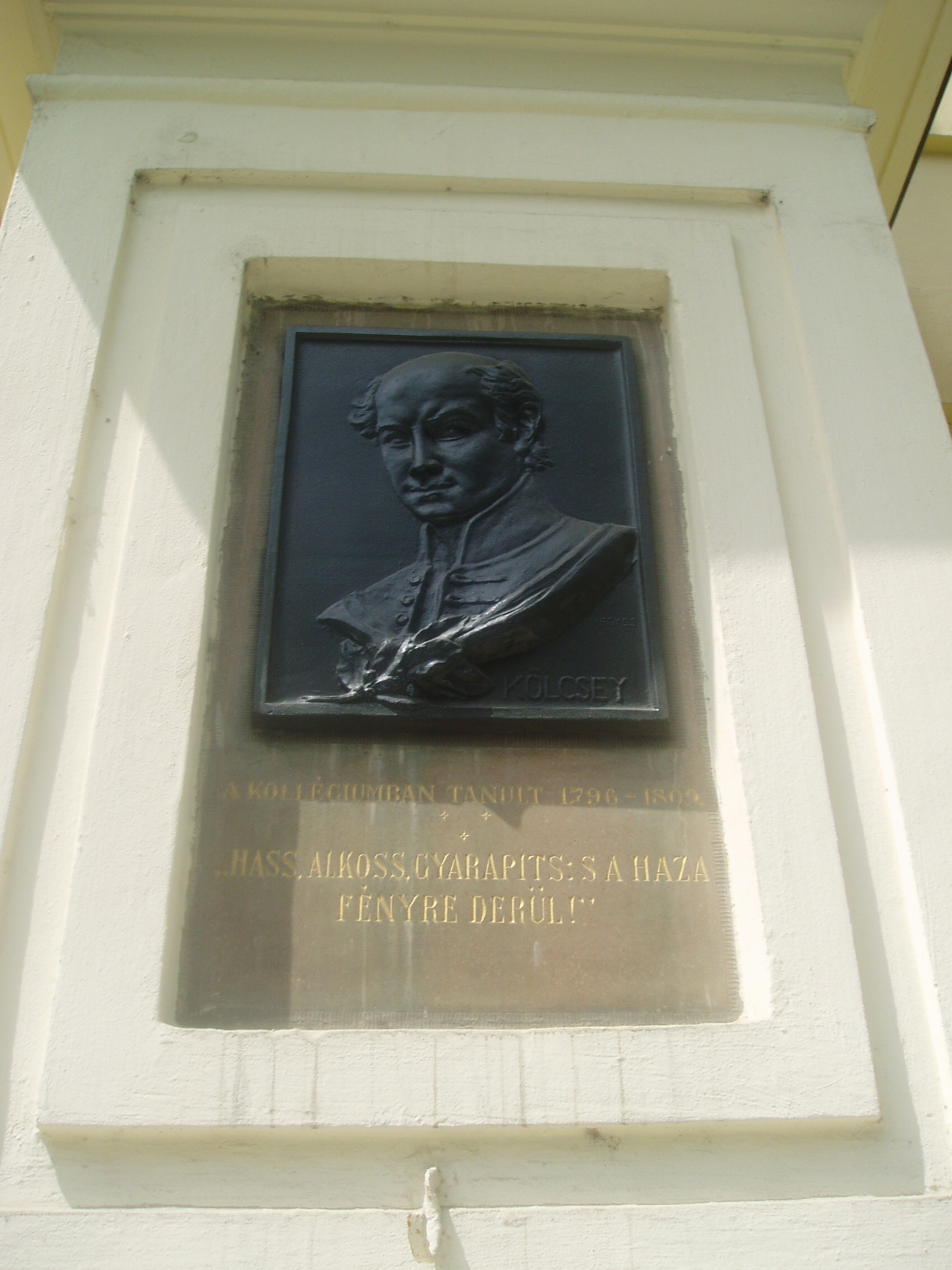 Nyilvános 1029 | 1568 | Debrecen, Kálvin tér 16. Református Kollégium: Kölcsey Ferenc domborműve | A Kollégium mai épülete a magyar klasszicista építészet nagyszerű példája. A főbejárat homlokzatát Nagy Sándor János bronz domborművei díszítik. Kettős oszlopot hordozó széles táblán Kálvin és Zwingli egymással szembeforduló alakja látható. A mellette lévő oszlopon Arany János bronz domborművét találhatjuk, míg a Füvészkert utca felől Csokonai Vitéz Mihály emlékét örökítették meg. Ugyancsak a főbejáraton látható Kölcsey Ferenc portréja, Nagy Sándor János egyik legszebb alkotása. A sort Fazekas Mihály és Móricz Zsigmond portréja egészíti ki. Medgyessy Ferenc bronz domborműve a kollégium hősi halottainak, tanároknak és diákoknak állít emléket. A képen Kölcsey Ferenc domborműve látható, aki tizenhárom éven keresztül volt a Kollégium diákja, a jogot is itt végezte. A fénykép 2006 júniusában készült. Felh. irod.: Kovács Gergelyné: Debrecen. Bp. Panoráma, 1981 Papp Antal: Debrecen. Bp. Panoráma, 1976 Győri L. János: "Egész Magyarországnak és Erdélynek világosító lámpása": a debreceni Református Kollégium története. Debrecen, 2006 |