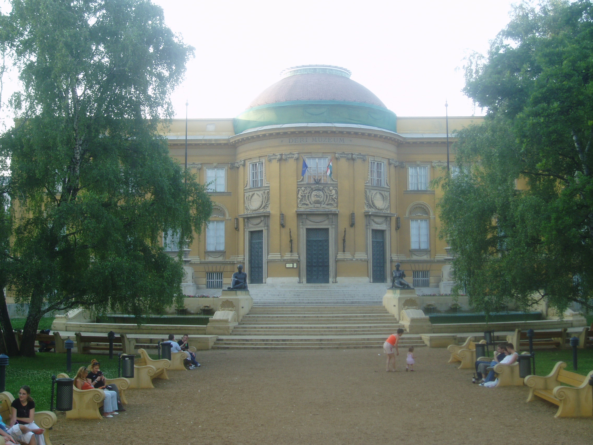 Nyilvános 1031 | 1799 | Debrecen, Déri tér 1. Déri Múzeum | Debrecen központjában, a Déri tér 1. szám alatt található a neobarokk stílusú, európai hírű Déri Múzeum, mely Györgyi Dénes és Münnich Aladár tervei alapján épült, és 1930-ban nyitotta meg kapuit a látogatók előtt. A múzeum különleges tárgyi anyagának alapját az 1902-ben Löfkovics Artúr ékszerész-műgyűjtő (lásd: Debrecen, Piac u. 38.) kezdeményezésére és adományából megalakult Városi Múzeum anyaga képezte. Nagy jelentőségű volt, hogy 1920-ban Déri Frigyes (1852-1924) bécsi selyemgyáros csodálatos gyűjteményét Debrecen városának ajándékozta. Bátyja példáját követve, 1938-ban Déri György a Kárpát-medence minden népének népművészeti alkotásaiból álló, páratlan gyűjteményét adományozta a múzeumnak. A későbbiek során neves néprajzkutatók, történészek, régészek gyarapították tovább kitartó gyűjtőmunkájukkal ezt a gazdag tárgyegyüttest. A múzeum és azon belül a képzőművészeti gyűjtemény legnagyobb vonzereje Munkácsy Mihály "Krisztus-trilógiájá"-nak együtt látható festményei: a Krisztus Pilátus előtt, a Golgota és az Ecce homo. Mint Szabó Magda Für Elise című regényében olvasható, az Ecce homo festmény kapcsán történt meg vele az az eset, ami sokáig rányomta bélyegét iskolai megítélésére. A közös múzeumlátogatás után magyar dolgozatot kellett írni a festmény egy alakjáról, s Szabó Magda a kép előterében levő kóbor kutyát választotta. S bár írását az osztály szeme láttára kellett miszlikbe szaggatnia, ugyanakkor általa megszerezte egy kitűnő tanár támogatását, akinek íróvá válásában sokat köszönhetett. A fénykép 2006 júniusában készült. Felh. irod.: www.museum.hu Szabó Magda: Für Elise. Bp. Európa Kiadó, 2002 |