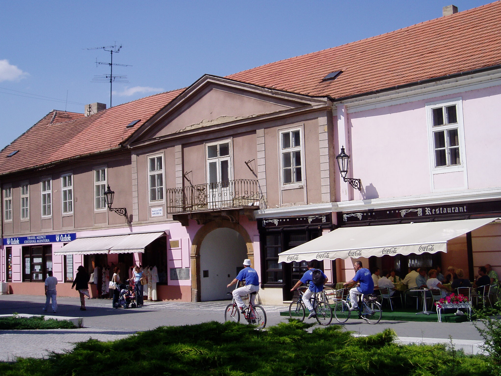 Nyilvános 1088 | 2182 | Komárom (Komárno). Klapka tér 9. Zichy-palota | A Klapka tér legnagyobb épülete a volt Zichy–palota. Zichy Miklós gróf, szabolcsi főispán építtette a XVII. század második felében. Eredetileg barokk stílusú volt, de miután a 1763-as nagy komáromi földrengés romba döntötte, klasszicista stílusban épült újjá, két épületszárnnyal bővülve. Udvarának végén az 1800-as évek elejétől 1827-ig emeletes épület állt, ennek emeleti részén tartották a táncmulatságokat és a színházi előadásokat. Az első hivatásos magyar színtársulat Komáromban Benke József és Kemény János vezetésével lépett fel 1811 májusában (ők a második pesti színtársulatból váltak ki). A társulatban ott volt Balogh István, Déry István, Láng Ádám, Murányi Zsigmond, Murányiné Lefèvre Teréz és a pályája legelején levő, tizennyolc éves Scheckenbach (Schenbach) Róza, aki később Déryné Széppataki Róza néven vált a magyar játékszín történetének állócsillagává. Legközelebb Balogh István székesfehérvári társulata jutott el Komáromba, valamikor 1813 és 1815 között. Szinnyei József szerint ennek a társulatnak Katona József is tagja volt, s Idegen művésznéven fellépett itt a Hamlet címszerepében és saját, Luca széke című darabjában. 1819 októberében Kilényi Dávid kecskeméti társulata érkezett a városba. Előadásaikról Ásvay Jókay József, Jókai Mór édesapja tudósított a helyi sajtóban. A közelmúltban a Zichy–palota udvarán építették ki az ún. Európa udvart. A helyi viszonylatban gigantikus méretű vállalkozás célja, hogy élőben mutassa be harmincöt európai ország építészetét. A városrész egyben Komárom új szolgáltató központja is, üzletekkel, éttermekkel, kávézókkal, valamint egy föld alatti bevásárlóközponttal. A palota első emeletén (bejárat a képen látható kapun a Szentháromság-szobor mellett) a város két híres szülötte, Jókai Mór és Lehár Ferenc emlékkiállítása látható. Különösen a Jókai-kiállítás gazdag eredeti relikviákban. A fénykép 2005. júliusában készült. Felh.irod.: www.komarno.sk Mácza Mihály: Komárom nevezetességei. Pozsony, Madách-Posonium, 2002 Szénássy Zoltán: Rév–Komárom. KT Kiadó, 1998 Tóth László: "...miként hajdan az apostolok" : a komáromi magyar színjátszás története. Dunaszerdahely, Lilium Aurum, 1997 |