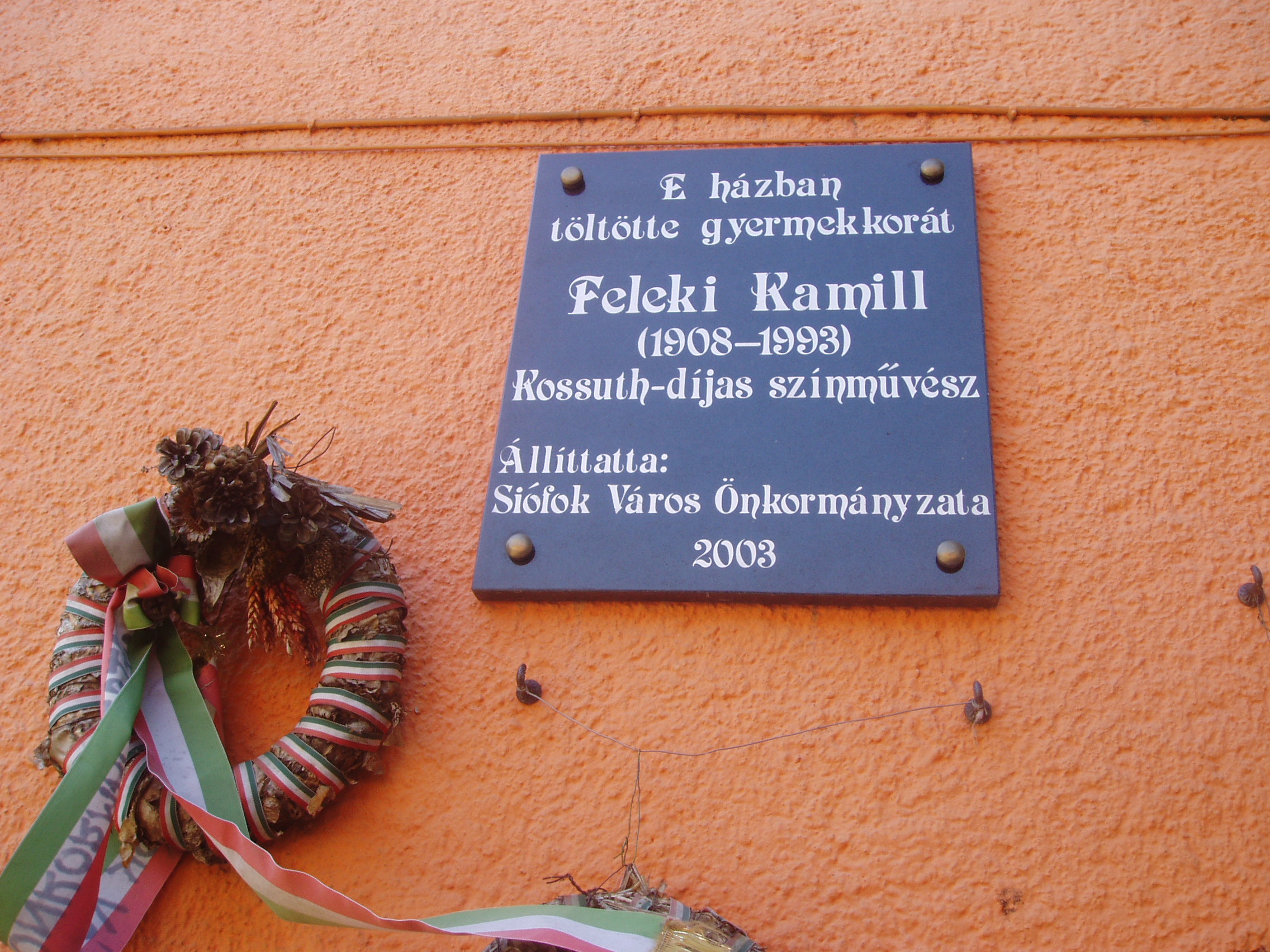 Nyilvános 1131 | 2238 | Siófok, Kálmán Imre sétány 3. | A város szívében, a sétálóutca központi részén található az egykori Kovács cukrászda, amely ma Siófok egyik legkellemesebb hangulatú étterme. Homlokzatán Feleki Kamillra, az operett műfajának kimagasló egyéniségére emlékező fekete márványtábla fogadja a sétálót, aki gyermekkorában ebben a házban töltötte nyarait testvéreivel együtt. A házban apai nagyszülei vezették az akkori vendéglőt. A fénykép 2006 júliusában készült. Felh. irod.: Matyikó Sebestyén József: Feleki Kamill és Siófok. = Siófoki Hírek 2003. júl. 23. |