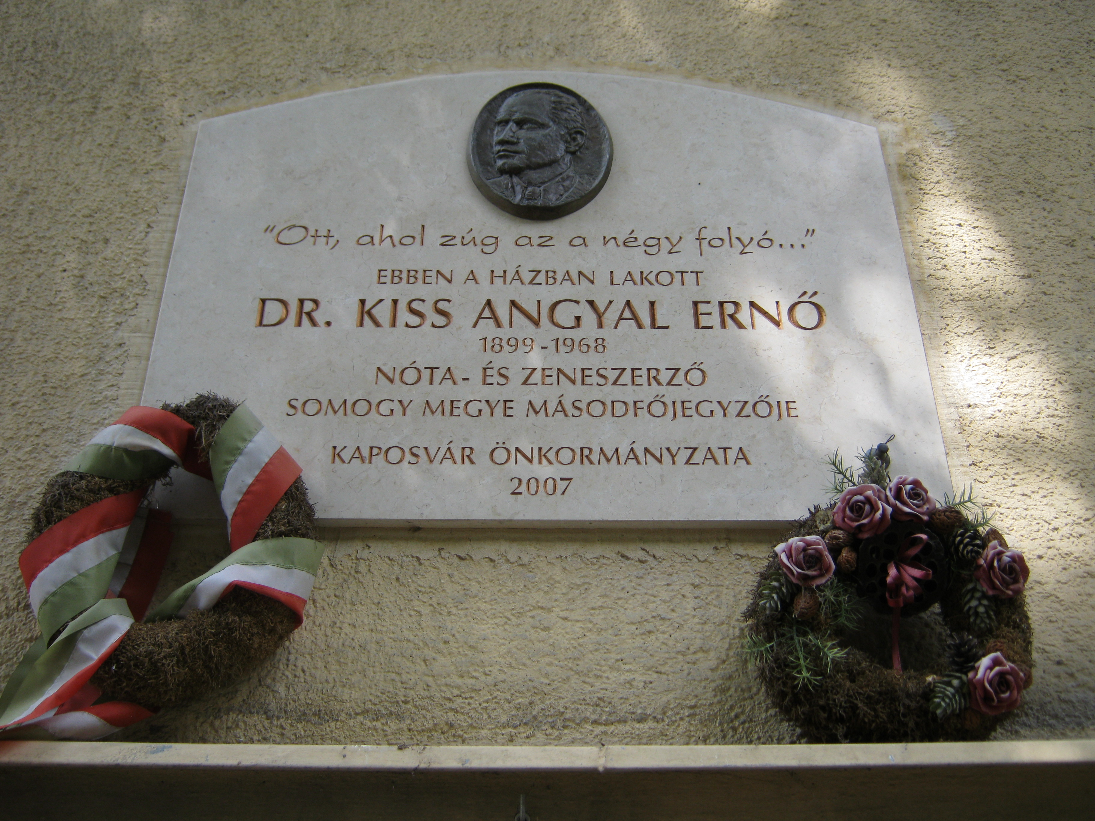 Nyilvános 1058 | 1582 | Kaposvár, Bajcsy-Zsilinszky utca 5. | Ebben a házban lakott Kiss Angyal Ernő (1899-1968), Somogy megye egykori helyettes főjegyzője, ismert nótaszerző. Több dalát itt komponálta. Emléktábláját 2007. október 1-jén, a Zene Világnapja alkalmából állították. A fénykép 2010 augusztusában készült. |