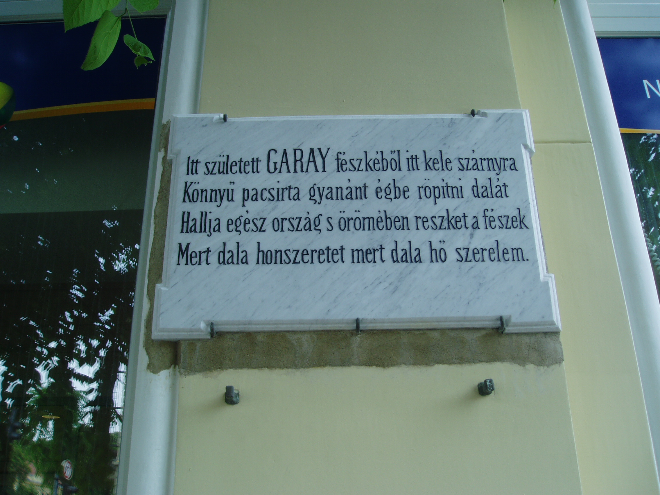 Nyilvános 1021 | 1575 | Szekszárd, Széchenyi utca 40. Diczenty-ház | A mostani városi bérpalota, a XIX. század végén eklektikus stílusban épült ún. Diczenty-ház helyén állott az a földszintes sarokház, amelyben Garay János költő született. 1881-ben még az eredeti házon helyezték el a költő emléktábláját, amelyet aztán áttettek a helyére épült Diczenty-házra. Ma viszont az eredeti táblának már csak egy másolata látható, csak Szász Károly verssorai ugyanazok... Az 1812. október 12-én született Garay János apja kereskedő, árvaszéki teendőkkel megbízott, köztiszteletben álló szekszárdi polgár volt. Anyja, Valter Ilona tizenkét gyermeknek adott életet. A szekszárdi gyermekkor meghatározóvá vált a költő számára. Házukban otthonos volt az új magyar irodalom, és Garayban hamarosan mutatkozott a költői hajlam. Legismertebb műve, Háry Jánosról szóló elbeszélő költeménye is szekszárdi élményből született. A fénykép 2006 júliusában készült. Felh. irod.: www.csatolna.hu/hu/korbejart/garay.shtml Hegedűs Géza: A magyar irodalom arcképcsarnoka. Bp. Trezor, 1993 |