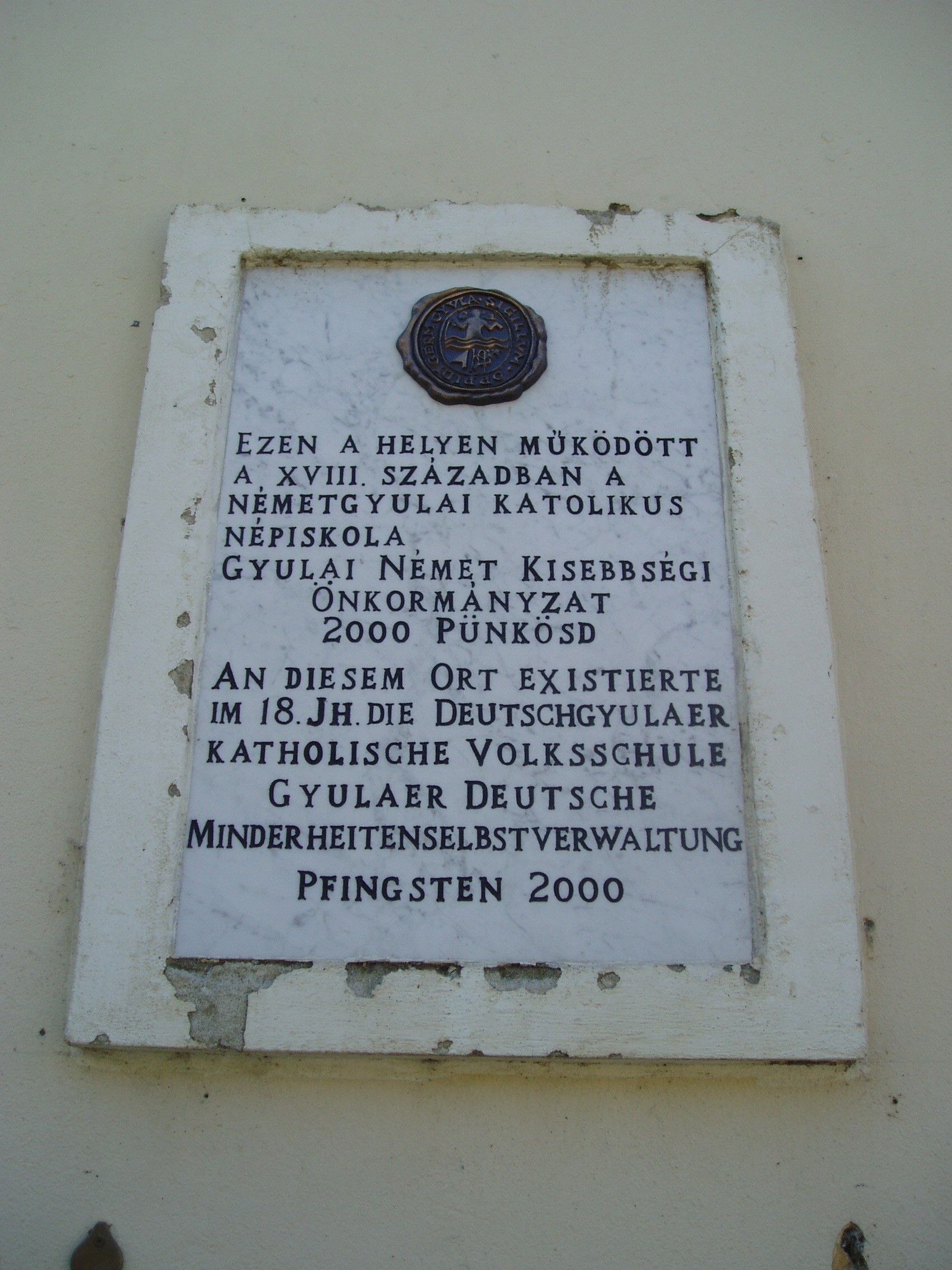 Nyilvános 1282 | 2870 | Gyula, Apor Vilmos tér 1. | Az egykori Németgyula központja az Apor Vilmos mártír püspökről, az egykori gyulai plébánosról elnevezett tér. Meghatározó eleme a közepén álló Szent József-templom, illetve néhány körülötte álló XVIII-XIX. századi épület. Ezek egyike, az egykori németgyulai városháza látható a képen. Régebbi szárnya 1820 körül épült klasszicista stílusban, s 1857-ig ebben működött a városháza. A bal oldali klasszicizáló szárnyat 1874-ben toldották hozzá. Gyula és Németgyula egyesítése óta iskola működik benne. A bejárat mellett emléktábla jelzi, hogy itt, a tanítói lakban született dr. Scherer Ferenc (1889-1987), Gyula városának monográfusa, mely mindmáig az egyik legjobb magyarországi városmonográfia. A másik, kétnyelvű emléktáblát a gyulai németek betelepítésének 270. évfordulója alkalmából helyezték el 1994-ben. A fénykép 2007 júliusában készült. Felh. irod.: Czeglédi Imre: Gyula útikalauz. 2. bőv. kiad. Gyula, 1995 |