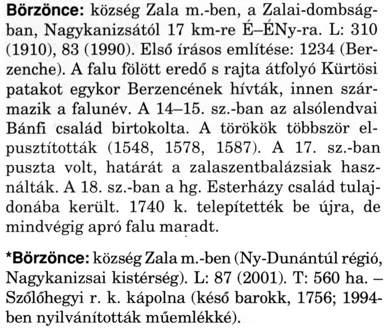Nyilvános 2174 | 5860 | A szócikkek felismertetett szövege: | (A csillag után a kiegészítő kötetből származó szöveg következik) Börzönce: község Zala m.-ben, a Zalai-dombságban, Nagykanizsától 17 km-re É-ÉNy-ra. L: 310 (1910), 83 (1990). Első írásos említése: 1234 (Ber-zenche). A falu fölött eredő s rajta átfolyó Kürtösi patakot egykor Berzencének hívták, innen származik a falunév. A 14-15. sz.-ban az alsólendvai Bánfi család birtokolta. A törökök többször elpusztították (1548, 1578, 1587). A 17. sz.-ban puszta volt, határát a zalaszentbalázsiak használták. A 18. sz.-ban a hg. Esterházy család tulajdonába került. 1740 k. telepítették be újra, de mindvégig apró falu maradt. *Börzönce: község Zala m.-ben (Ny-Dunántúl régió, Nagykanizsai kistérség). L: 87 (2001). T: 560 ha. -Szőlőhegyi r. k. kápolna (késő barokk, 1756; 1994-ben nyilvánították műemlékké). A szócikkek a következő lexikonból származnak: Cím: Magyar nagylexikon Közreműködő: Élesztős László (1949) (szerk.) ; Barabás Éva (1943) (szerk.) ; Berényi Gábor (1946) (szerk.) ; Bárány Lászlóné (szerk.) ; Adelmann-né Kertész Judit (1945) (közrem.) ; Froemel Károlyné Jáky Éva (1936) (közrem.) ; Akadémiai Kiadó és Nyomda Vállala Szerz. közl.: [... Élesztős László főszerk.] ; [szerk. Barabás Éva et al.] ; [bibliogr. Adelmanné Kertész Judit] ; [kész. az Akadémiai Kiadó Magyar Nagylexikon Szerkesztőségében] Kiadás: Budapest : Akad. K., 1993- Kötetei: 1. köt., A - Anc 2. köt., And - Bag 3. köt., Bah - Bij 4. köt., Bik - Bz 5. köt., C - Csem 6. köt., Csen - Ec 7. köt., Ed - Fe 8. köt., Ff - Gyep 9. köt., Gyer - Iq 10. köt., Ir - Kip 11. köt., Kir - Lem 12. köt., Len - Mep 13. köt., Mer - Nyk 14. köt., Nyl - Pom 15. köt., Pon - Sek 16. köt., Sel - Szö 17. köt., Szp - Ung 18. köt., Unh - Z 19. köt., Kiegészítő kötet, A - Z ETO jelzet: 030=945.11 Szakjelzet: 030 Cutter: M 14 ISBN: 963-05-6611-7 [!ISBN 963-05-6615-X] Nyelv: magyar Megjegyzés: Az 5. kötettől kiad. a Magyar Nagylexikon Kiadó ; A 6. kötettől főszerk. Berényi Gábor ; A 6. kötettől szakszerk. Bárány Lászlóné et al. ; A 6. kötettől bibliogr. Froemel Károlyné ; Bibliogr. a szócikkek végén |