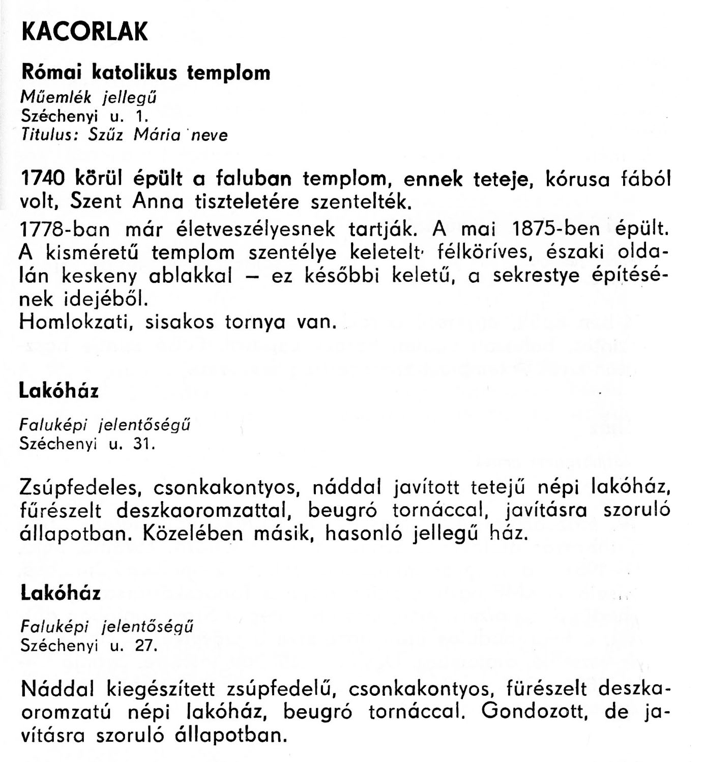 Nyilvános 2248 | 7127 | Kacorlak - Zala megye műemlékei 1977 061-062old | A részlet szövege: KACORLAK Római katolikus templom Műemlék jellegű Széchenyi u. 1. Titulus: Szűz Mária neve 1740 körül épült a faluban templom, ennek teteje, kórusa fából volt, Szent Anna tiszteletére szentelték. 1778-ban már életveszélyesnek tartják. A mai 1875-ben épült. A kisméretű templom szentélye keletelt, félköríves, északi oldalán keskeny ablakkal - ez későbbi keletű, a sekrestye építésének idejéből. Homlokzati, sisakos tornya van. Lakóház Faluképi jelentőségű Széchenyi u. 31. Zsúpfedeles, csonkakontyos, náddal javított tetejű népi lakóház, fűrészelt deszkaoromzattal, beugró tornáccal, javításra szoruló állapotban. Közelében másik, hasonló jellegű ház. Lakóház Faluképi jelentőségű Széchenyi u. 27. Náddal kiegészített zsúpfedelű, csonkakontyos, fűrészelt deszka-oromzatú népi lakóház, beugró tornáccal. Gondozott, de javításra szoruló állapotban. A részlet a következő könyvből származik: Cím: Zala megye műemlékei Szerző: Németh József (1928) Közreműködő: Lantos Miklós (fotó) Szerz. közl.: Németh József ; [fotók... Lantos Miklós] Kiadás: Zalaegerszeg : Zalai Ny., 1977 ETO jelzet: 72(439.121) ; 7.025.3/.4 ; 908.439.121 Tárgyszó: Zala megye Szakjelzet: 908 Cutter: N 53 Nyelv: magyar Oldalszám: 109 p. |