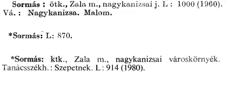 Nyilvános 1990 | 5628 | A szócikkek felismertetett szövege: | (Az első csillag után az 1972-es, a második csillag után az 1981-es kiadású kiegészítő kötetből származó szöveg következik) Sormás: ötk., Zala m., nagykanizsai j. L: 1000 (1960). Vá.: Nagykanizsa. Malom. *Sormás: L: 870. *Sormás: ktk., Zala m., nagykanizsai városkörnyék. Tanácsszékh.: Szepetnek. L: 914 (1980). A szócikkek a következő lexikonból származnak: Cím: Új magyar lexikon Közreműködő: Berei Andor (1900-1979) (szerk.) Szerz. közl.: [szerk. Berei Andor et al.] Kiadás jelzés: 2. lny. Kiadás: Budapest : Akad. K., 1961-1962 Kötetei: 1., A - C 2., D - F 3., G - J 4., K - Me 5., Mf - R 6., S - Z 7. köt., A-Z Kiegészítő kötet (1972) Kiegészítő kötet, 1962÷1980 (1981) ETO jelzet: 03=945.11 Szakjelzet: 030 Cutter: U 28 Nyelv: magyar Megjegyzés: Bibliogr. a címszavak egy részének végén |