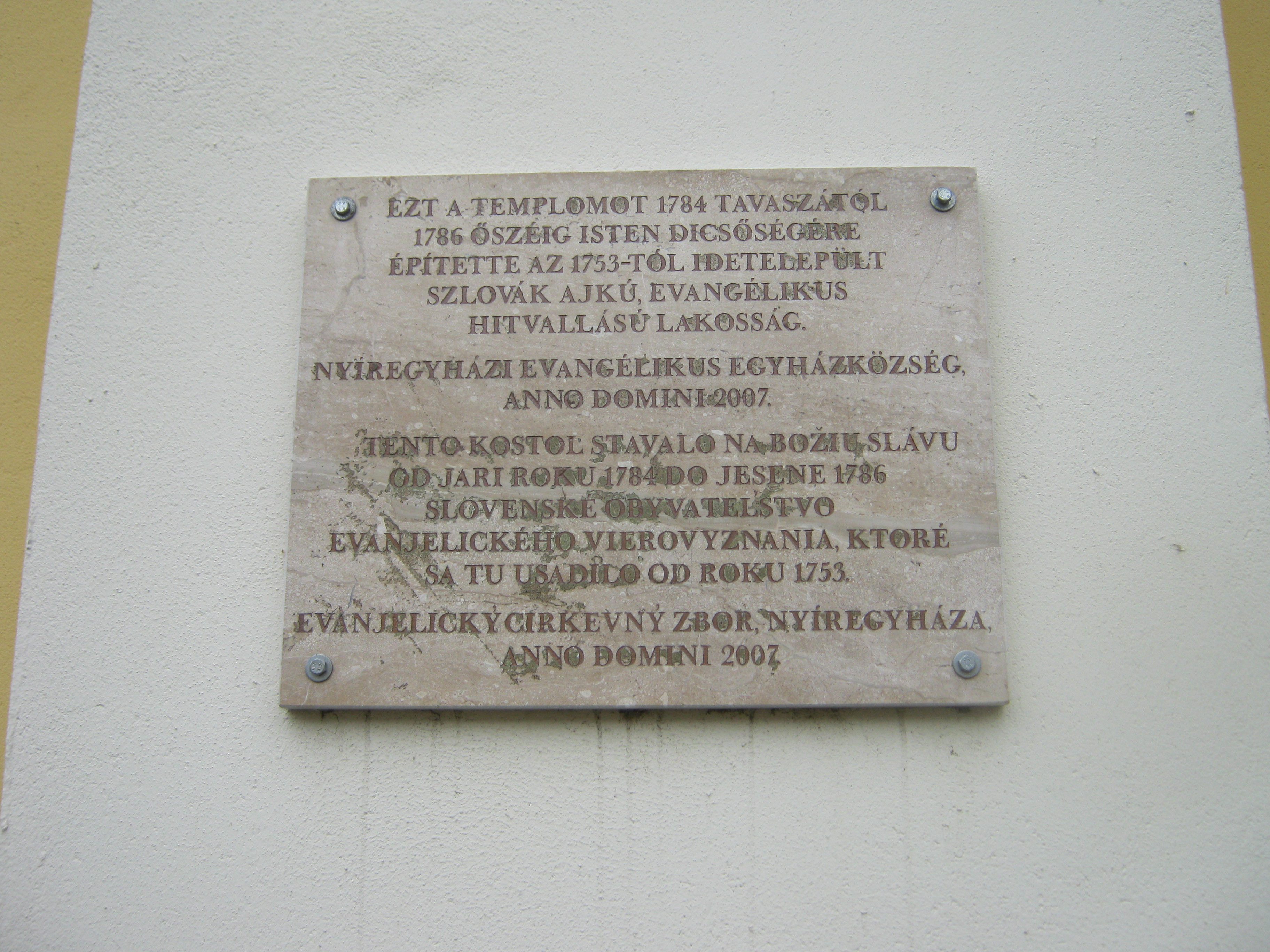 Nyilvános 932 | 1268 | Nyíregyháza, Luther tér 1. Evangélikus templom | A késő barokk épület tervezője Giuseppe Aprilis volt, alapkövét 1784-ben rakták le, s két év múlva fel is szentelhették. Építtetője az 1750-es évek közepétől Nyíregyházára települt szlovák ajkú, evangélikus hitvallású lakosság volt. Belső díszítőfestése a nyíregyházi Benczúr Gyula tervei alapján készült. 1910-ből származó orgonája Rieger Ottó műve. Az 1928-ban készült harangjáték a Luther Márton által írt "Jövel Szentlélek Úristen" kezdetű ének első két sorát játssza. A fénykép 2010 augusztus elején készült. Felh. irod.: Látnivalók Szabolcs-Szatmár-Bereg megyében. Miskolc, Well-PRess, 1999 |