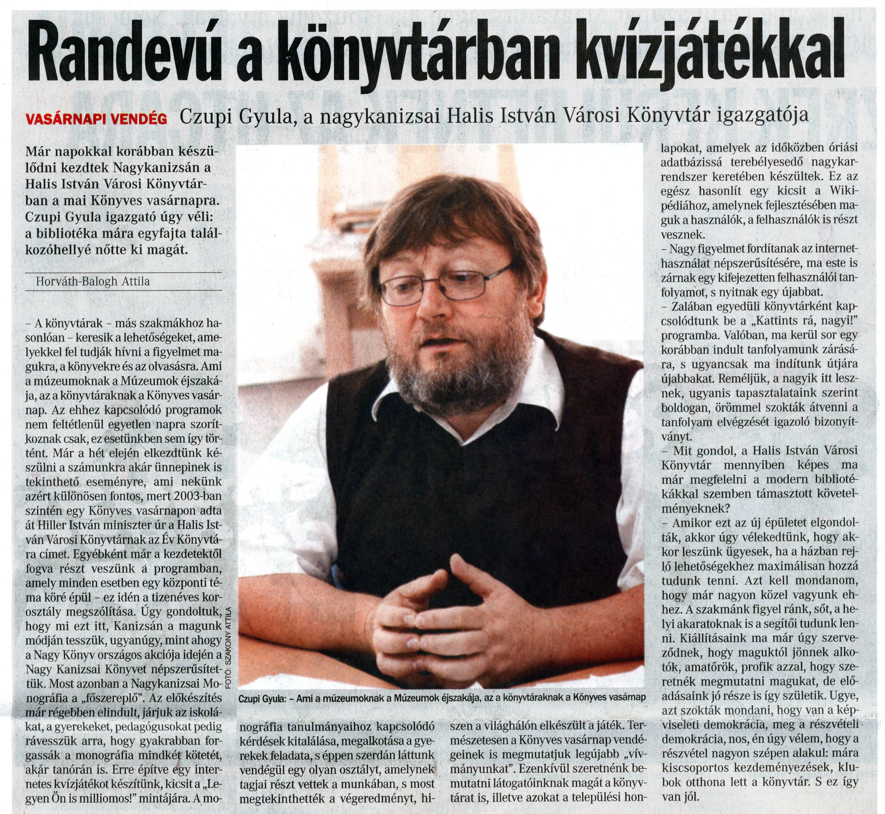 Nyilvános 1089 | 1731 | Vasárnapi Zalai Hírlap 2008. október 12. 041. szám 3. oldal - Randevú a könyvtárban kvízjátékkal | A cikk szövege: Randevú a könyvtárban kvízjátékkal vasárnapi vendég Czupi Gyula, a nagykanizsai Halis István Városi Könyvtár igazgatója Már napokkal korábban készülődni kezdtek Nagykanizsán a Halis István Városi Könyvtárban a mai Könyves vasárnapra. Czupi Gyula igazgató úgy véli: a bibliotéka mára egyfajta találkozóhellyé nőtte ki magát. Horváth-Balogh Attila - A könyvtárak - más szakmákhoz hasonlóan - keresik a lehetőségeket, amelyekkel fel tudják hívni a figyelmet magukra, a könyvekre és az olvasásra. Ami a múzeumoknak a Múzeumok éjszakája, az a könyvtáraknak a Könyves vasárnap. Az ehhez kapcsolódó programok nem feltétlenül egyetlen napra szorítkoznak csak, ez esetünkben sem így történt. Már a hét elején elkezdtünk készülni a számunkra akár ünnepinek is tekinthető eseményre, ami nekünk azért különösen fontos, mert 2003-ban szintén egy Könyves vasárnapon adta át Hiller István miniszter úr a Halis István Városi Könyvtárnak az Év Könyvtára címet. Egyébként már a kezdetektől fogva részt veszünk a programban, amely minden esetben egy központi téma köré épül - ez idén a tizenéves korosztály megszólítása. Úgy gondoltuk, hogy mi ezt itt, Kanizsán a magunk módján tesszük, ugyanúgy, mint ahogy a Nagy Könyv országos akciója idején a Nagy Kanizsai Könyvet népszerűsítettük. Most azonban a Nagykanizsai Monográfia a „főszereplő". Az előkészítés már régebben elindult, járjuk az iskolákat, a gyerekeket, pedagógusokat pedig rávesszük arra, hogy gyakrabban forgassák a monográfia mindkét kötetét, akár tanórán is. Erre építve égy internetes kvízjátékot készítünk, kicsit a „Legyen Ön is milliomos!" mintájára. A mo- Czupi Gyula: - Ami a múzeumoknak a Múzeumok éjszakája, az a könyvtáraknak a Könyves vasárnap nográfia tanulmányaihoz kapcsolódó kérdések kitalálása, megalkotása a gyerekek feladata, s éppen szerdán láttunk vendégül egy olyan osztályt, amelynek tagjai részt vettek a munkában, s most megtekinthették a végeredményt, hi- szen a világhálón elkészült a játék. Természetesen a Könyves vasárnap vendégeinek is megmutatjuk legújabb „vívmányunkat". Ezenkívül szeretnénk bemutatni látogatóinknak magát a könyvtárat is, illetve azokat a települési hon- lapokat, amelyek az időközben óriási adatbázissá terebélyesedő nagykarrendszer keretében készültek. Ez az egész hasonlít egy kicsit a Wikipédiához, amelynek fejlesztésében maguk a használók, a felhasználók is részt vesznek. - Nagy figyelmet fordítanak az internethasználat népszerűsítésére, ma este is zárnak egy kifejezetten felhasználói tanfolyamot, s nyitnak egy újabbat. - Zalában egyedüli könyvtárként kapcsolódtunk be a „Kattints rá, nagyi!" programba. Valóban, ma kerül sor egy korábban indult tanfolyamunk zárására, s ugyancsak ma indítunk útjára újabbakat Reméljük, a nagyik itt lesznek, ugyanis tapasztalataink szerint boldogan, örömmel szokták átvenni a tanfolyam elvégzését igazoló bizonyítványt. - Mit gondol, a Halis István Városi Könyvtár mennyiben képes ma már megfelelni a modern bibliotékákkal szemben támasztott követelményeknek? - Amikor ezt az új épületet elgondolták, akkor úgy vélekedtünk, hogy akkor leszünk ügyesek, ha a házban rejlő lehetőségekhez maximálisan hozzá tudunk tenni. Azt kell mondanom, hogy már nagyon közel vagyunk ehhez. A szakmánk figyel ránk, sőt, a helyi akaratoknak is a segítői tudunk lenni. Kiállításaink ma már úgy szerveződnek, hogy maguktól jönnek alkotók, amatőrök, profik azzal, hogy szeretnék megmutatni magukat, de előadásaink jó része is így születik. Ugye, azt szokták mondani, hogy van a képviseleti demokrácia, meg a részvételi demokrácia, nos, én úgy vélem, hogy a részvétel nagyon szépen alakul: mára kiscsoportos kezdeményezések, klubok otthona lett a könyvtár. S ez így van jól. |