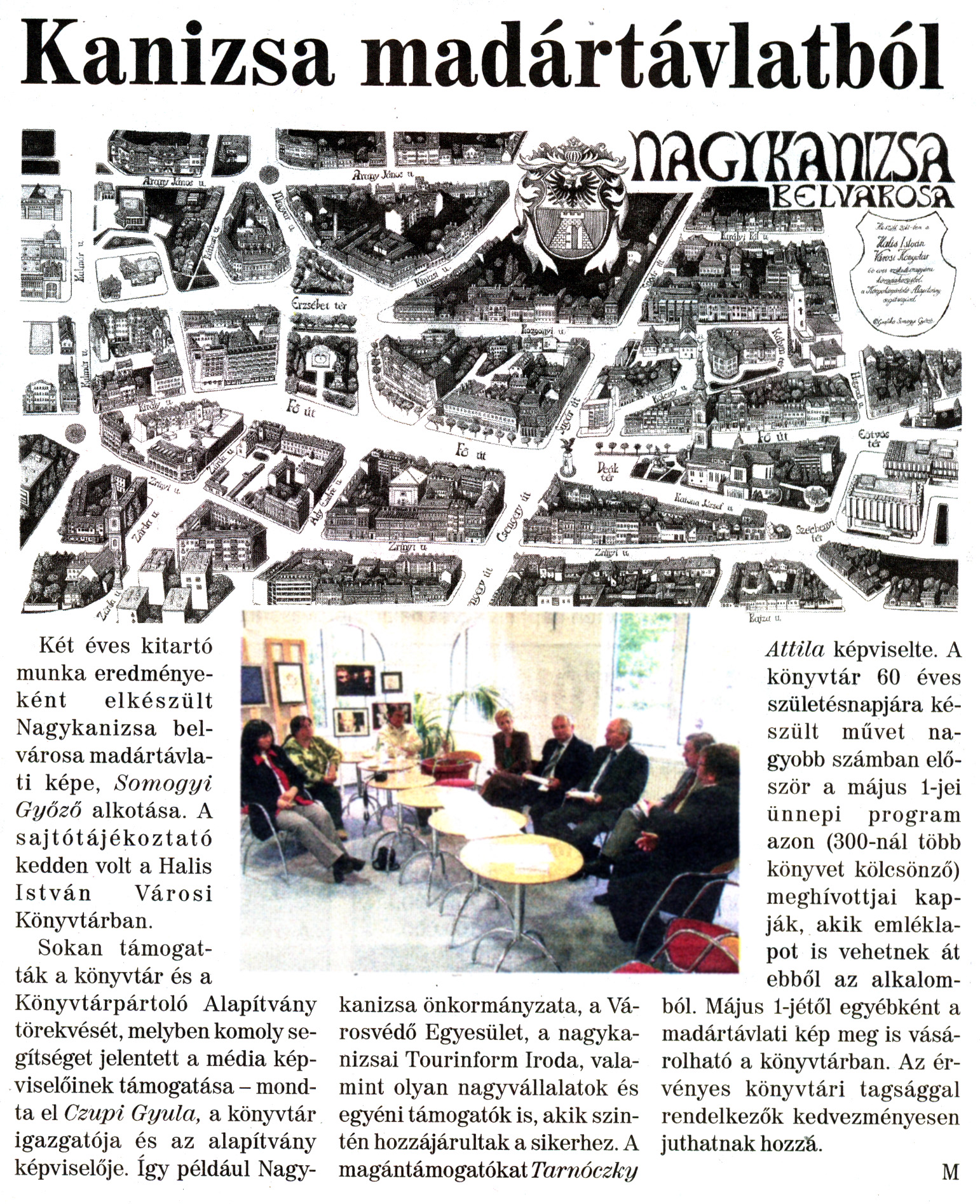 Nyilvános 1991 | 7153 | Nagykanizsai Maraton 2011. április 29. 17. szám 2. oldal - Kanizsa madártávlatból | A cikk szövege: Kanizsa madártávlatból Két éves kitartó munka eredményeként elkészült Nagykanizsa belvárosa madártávlati képe, Somogyi Győző alkotása. A sajtótájékoztató kedden volt a Halis István Városi Könyvtárban. Sokan támogatták a könyvtár és a Könyvtárpártoló Alapítvány törekvését, melyben komoly segítséget jelentett a média képviselőinek támogatása - mondta el Czupi Gyula, a könyvtár igazgatója és az alapítvány képviselője. Így például Nagy- kanizsa önkormányzata, a Városvédő Egyesület, a nagykanizsai Tourinform Iroda, valamint olyan nagyvállalatok és egyéni támogatók is, akik szintén hozzájárultak a sikerhez. A magántámogatókat Tarnóczky Attila képviselte. A könyvtár 60 éves születésnapjára készült művet nagyobb számban először a május 1-jei ünnepi program azon (300-nál több könyvet kölcsönző) meghívottjai kapják, akik emléklapot is vehetnek át ebből az alkalomból. Május 1-jétől egyébként a madártávlati kép meg is vásárolható a könyvtárban. Az érvényes könyvtári tagsággal rendelkezők kedvezményesen juthatnak hozzá. M |