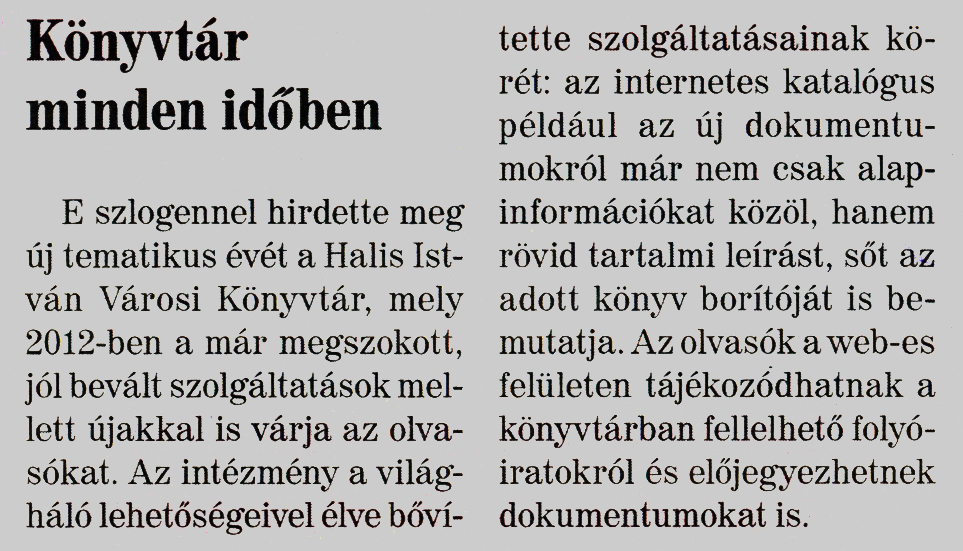 Nyilvános 1898 | 6133 | Nagykanizsai Maraton 2012. január 13. 1. szám 1. oldal - Könyvtár minden időben | Könyvtár minden időben E szlogennel hirdette meg új tematikus évét a Halis István Városi Könyvtár, mely 2012-ben a már megszokott, jól bevált szolgáltatások mellett újakkal is várja az olvasókat. Az intézmény a világháló lehetőségeivel élve bővítette szolgáltatásainak körét: az internetes katalógus például az új dokumentumokról már nem csak alapinformációkat közöl, hanem rövid tartalmi leírást, sőt az adott könyv borítóját is bemutatja. Az olvasók a web-es felületen tájékozódhatnak a könyvtárban fellelhető folyóiratokról és előjegyezhetnek dokumentumokat is. |