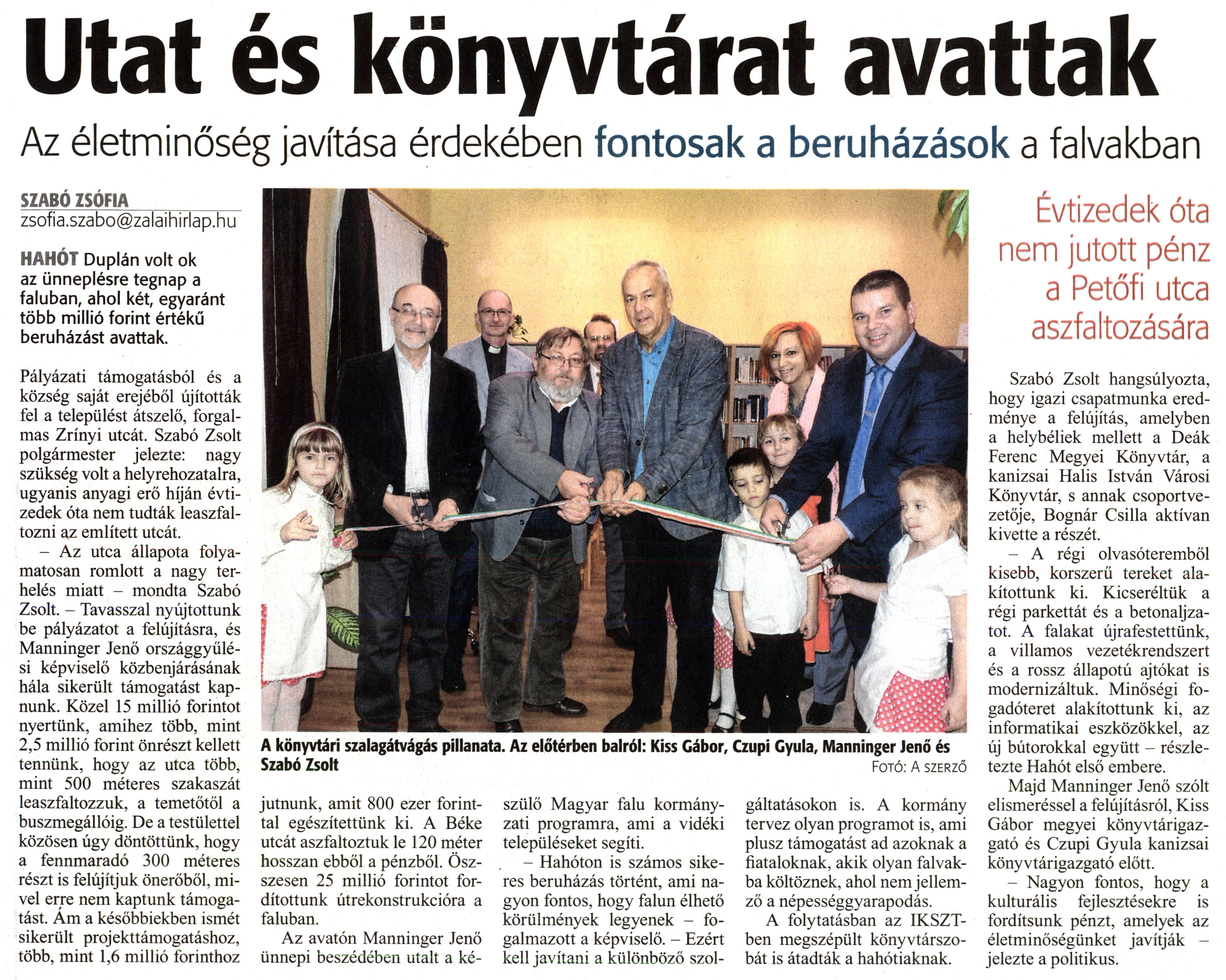 Nyilvános 1440 | 2470 | Zalai Hírlap 2018. november 24. 273. szám 3. oldal | Utat és könyvtárat avattak Az életminőség javítása érdekében fontosak a beruházások a falvakban A könyvtári szalagátvágás pillanata. Az előtérben balról: Kiss Gábor, Czupi Gyula, Manninger Jenő és Szabó Zsolt Fotó: A szerző SZABÓ ZSÓFIA_______ zsofia.szabo@zalaihirlap.hu HAHÓT Duplán volt ok az ünneplésre tegnap a faluban, ahol két, egyaránt több millió forint értékű beruházást avattak. Pályázati támogatásból és a község saját erejéből újították fel a települést átszelő, forgalmas Zrínyi utcát. Szabó Zsolt polgármester jelezte: nagy szükség volt a helyrehozatalra, ugyanis anyagi erő híján évtizedek óta nem tudták leaszfaltozni az említett utcát. - Az utca állapota folyamatosan romlott a nagy terhelés miatt - mondta Szabó Zsolt. - Tavasszal nyújtottunk be pályázatot a felújításra, és Manninger Jenő országgyűlési képviselő közbenjárásának hála sikerült támogatást kapnunk. Közel 15 millió forintot nyertünk, amihez több, mint 2,5 millió forint önrészt kellett tennünk, hogy az utca több, mint 500 méteres szakaszát leaszfaltozzuk, a temetőtől a buszmegállóig. De a testülettel közösen úgy döntöttünk, hogy a fennmaradó 300 méteres részt is felújítjuk önerőből, mivel erre nem kaptunk támogatást. Ám a későbbiekben ismét sikerült projekttámogatáshoz, több, mint 1,6 millió forinthoz jutnunk, amit 800 ezer forinttal egészítettünk ki. A Béke utcát aszfaltoztuk le 120 méter hosszan ebből a pénzből. Összesen 25 millió forintot fordítottunk útrekonstrukcióra a faluban. Az avatón Manninger Jenő ünnepi beszédében utalt a ké- szülő Magyar falu kormányzati programra, ami a vidéki településeket segíti. - Hahóton is számos sikeres beruházás történt, ami nagyon fontos, hogy falun élhető körülmények legyenek - fogalmazott a képviselő. - Ezért kell javítani a különböző szol- gáltatásokon is. A kormány tervez olyan programot is, ami plusz támogatást ad azoknak a fiataloknak, akik olyan falvakba költöznek, ahol nem jellemző a népességgyarapodás. A folytatásban az IKSZT-ben megszépült könyvtárszobát is átadták a hahótiaknak. Évtizedek óta nem jutott pénz a Petőfi utca aszfaltozására Szabó Zsolt hangsúlyozta, hogy igazi csapatmunka eredménye a felújítás, amelyben a helybéliek mellett a Deák Ferenc Megyei Könyvtár, a kanizsai Halis István Városi Könyvtár, s annak csoportvezetője, Bognár Csilla aktívan kivette a részét. - A régi olvasóteremből kisebb, korszerű tereket alakítottunk ki. Kicseréltük a régi parkettát és a betonaljzatot. A falakat újrafestettünk, a villamos vezetékrendszert és a rossz állapotú ajtókat is modernizáltuk. Minőségi fogadóteret alakítottunk ki, az informatikai eszközökkel, az új bútorokkal együtt - részletezte Hahót első embere. Majd Manninger Jenő szólt elismeréssel a felújításról, Kiss Gábor megyei könyvtárigazgató és Czupi Gyula kanizsai könyvtárigazgató előtt. - Nagyon fontos, hogy a kulturális fejlesztésekre is fordítsunk pénzt, amelyek az életminőségünket javítják - jelezte a politikus. |