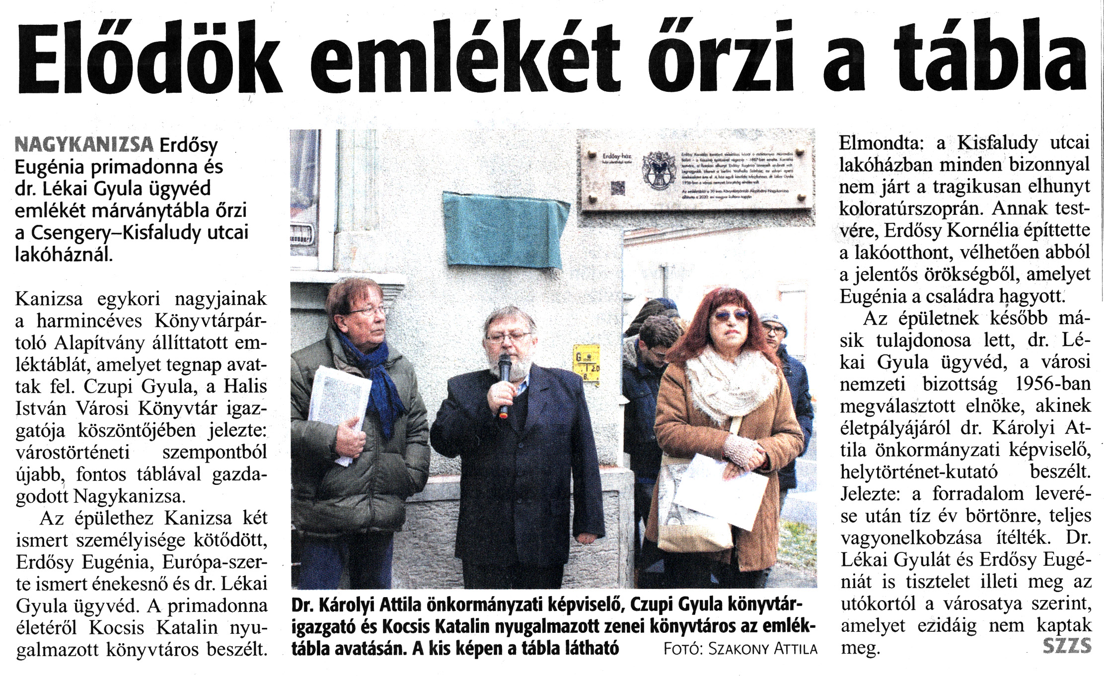 Nyilvános 1388 | 2452 | Zalai Hírlap 2020. január 23. 19. szám 3. oldal | Elődök emlékét őrzi a tábla NAGYKANIZSA Erdősy Eugénia primadonna és dr. Lékai Gyula ügyvéd emlékét márványtábla őrzi a Csengery-Kisfaludy utcai lakóháznál. Kanizsa egykori nagyjainak a harmincéves Könyvtárpártoló Alapítvány állíttatott emléktáblát, amelyet tegnap avattak fel. Czupi Gyula, a Halis István Városi Könyvtár igazgatója köszöntőjében jelezte: várostörténeti szempontból újabb, fontos táblával gazdagodott Nagykanizsa. Az épülethez Kanizsa két ismert személyisége kötődött, Erdősy Eugénia, Európa-szerte ismert énekesnő és dr. Lékai Gyula ügyvéd. A primadonna életéről Kocsis Katalin nyugalmazott könyvtáros beszélt. Elmondta: a Kisfaludy utcai lakóházban minden bizonnyal nem járt a tragikusan elhunyt koloratúrszoprán. Annak testvére, Erdősy Kornélia építtette a lakóotthont, vélhetően abból a jelentős örökségből, amelyet Eugénia a családra hagyott. Az épületnek később másik tulajdonosa lett, dr. Lékai Gyula ügyvéd, a városi nemzeti bizottság 1956-ban megválasztott elnöke, akinek életpályájáról dr. Károlyi Attila önkormányzati képviselő, helytörténet-kutató beszélt. Jelezte: a forradalom leverése után tíz év börtönre, teljes vagyonelkobzása ítélték. Dr. Lékai Gyulát és Erdősy Eugéniát is tisztelet illeti meg az utókortól a városatya szerint, amelyet ezidáig nem kaptak meg. SZZS Dr. Károlyi Attila önkormányzati képviselő, Czupi Gyula könyvtárigazgató és Kocsis Katalin nyugalmazott zenei könyvtáros az emléktábla avatásán. A kis képen a tábla látható Fotó: Szakony Attila |