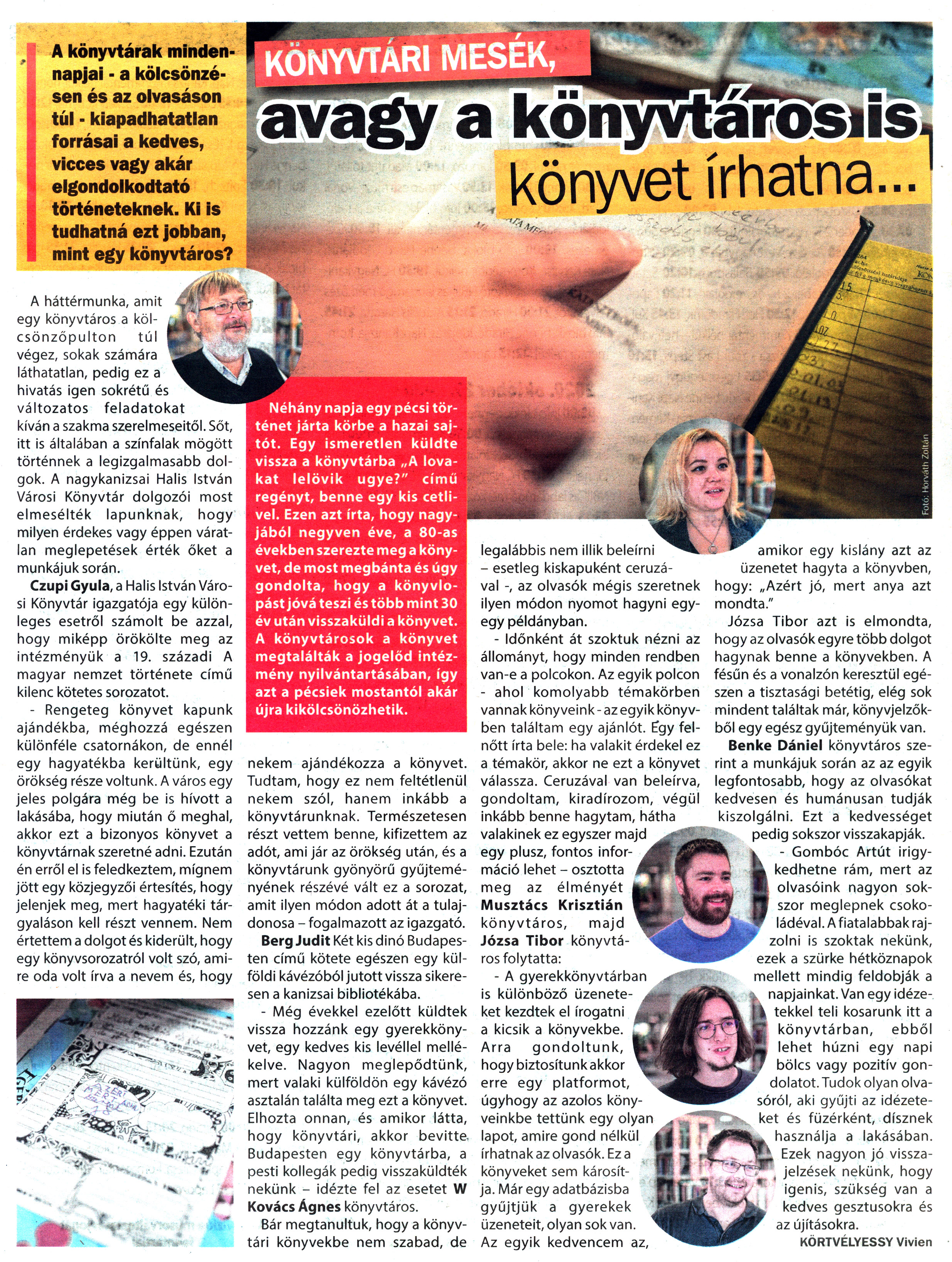 Nyilvános 1460 | 2345 | Kanizsa 2020. október 24. 38. szám 19old - Könyvtári mesék | KÖNYVTÁRI MESÉK, avagy a könyvtáros is könyvet írhatna... A könyvtárak mindennapjai - a kölcsönzésen és az olvasáson túl - kiapadhatatlan forrásai a kedves, vicces vagy akár elgondolkodtató történeteknek. Ki is tudhatná ezt jobban, mint egy könyvtáros? Nehany napja egy pécsi történet járta körbe a hazai sajtót. Egy ismeretlen küldte vissza a könyvtárba „A lovakat lelövik ugye?" című regényt, benne egy kis cetlivel. Ezen azt írta, hogy nagyjából negyven éve, a 80-as években szerezte meg a könyvet, de most megbánta és úgy gondolta, hogy a könyvlopást jóvá teszi és több mint 30 év után visszaküldi a könyvet. A könyvtárosok a könyvet megtalálták a jogelőd intézmény nyilvántartásában, így azt a pécsiek mostantól akár újra kikölcsönözhetik. A háttérmunka, amit egy könyvtáros a kölcsönzőpulton túl végez, sokak számára láthatatlan, pedig ez a hivatás igen sokrétű és változatos feladatokat kíván a szakma szerelmeseitől. Sőt, itt is általában a színfalak mögött történnek a legizgalmasabb dolgok. A nagykanizsai Halis István Városi Könyvtár dolgozói most elmesélték lapunknak, hogy milyen érdekes vagy éppen váratlan meglepetések érték őket a munkájuk során. Czupi Gyula, a Halis István Városi Könyvtár igazgatója egy különleges esetről számolt be azzal, hogy miképp örökölte meg az intézményük a 19. századi A magyar nemzet története című kilenc kötetes sorozatot. - Rengeteg könyvet kapunk ajándékba, méghozzá egészen különféle csatornákon, de ennél egy hagyatékba kerültünk, egy örökség része voltunk. A város egy jeles polgára még be is hívott a lakásába, hogy miután ő meghal, akkor ezt a bizonyos könyvet a könyvtárnak szeretné adni. Ezután én erről el is feledkeztem, mígnem jött egy közjegyzői értesítés, hogy jelenjek meg, mert hagyatéki tárgyaláson kell részt vennem. Nem értettem a dolgot és kiderült, hogy egy könyvsorozatról volt szó, amire oda volt írva a nevem és, hogy nekem ajándékozza a könyvet. Tudtam, hogy ez nem feltétlenül nekem szól, hanem inkább a könyvtárunknak. Természetesen részt vettem benne, kifizettem az adót, ami jár az örökség után, és a könyvtárunk gyönyörű gyűjteményének részévé vált ez a sorozat, amit ilyen módon adott át a tulajdonosa - fogalmazott az igazgató. Berg Judit Két kis dinó Budapesten című kötete egészen egy külföldi kávézóból jutott vissza sikeresen a kanizsai bibliotékába. - Még évekkel ezelőtt küldtek vissza hozzánk egy gyerekkönyvet, egy kedves kis levéllel mellékelve. Nagyon meglepődtünk, mert valaki külföldön egy kávézó asztalán találta meg ezt a könyvet. Elhozta onnan, és amikor látta, hogy könyvtári, akkor bevitte Budapesten egy könyvtárba, a pesti kollegák pedig visszaküldték nekünk - idézte fel az esetet W Kovács Ágnes könyvtáros. Bár megtanultuk, hogy a könyvtári könyvekbe nem szabad, de legalábbis nem illik beleírni - esetleg kiskapuként ceruzával -, az olvasók mégis szeretnek ilyen módon nyomot hagyni egy-egy példányban. - Időnként át szoktuk nézni az állományt, hogy minden rendben van-e a polcokon. Az egyik polcon - ahol komolyabb témakörben vannak könyveink - az egyik könyvben találtam egy ajánlót. Egy felnőtt írta bele: ha valakit érdekel ez a témakör, akkor ne ezt a könyvet válassza. Ceruzával van beleírva, gondoltam, kiradírozom, végül inkább benne hagytam, hátha valakinek ez egyszer majd egy plusz, fontos információ lehet - osztotta meg az élményét Musztács Krisztián könyvtáros, majd Józsa Tibor könyvtáros folytatta: - A gyerekkönyvtárban is különböző üzeneteket kezdtek el írogatni a kicsik a könyvekbe. Arra gondoltunk, hogy biztosítunk akkor erre egy platformot, úgyhogy az azolos könyveinkbe tettünk egy olyan lapot, amire gond nélkül írhatnak az olvasók. Ez a könyveket sem károsítja. Már egy adatbázisba gyűjtjük a gyerekek üzeneteit, olyan sok van. Az egyik kedvencem az, amikor egy kislány azt az üzenetet hagyta a könyvben, hogy: „Azért jó, mert anya azt mondta." Józsa Tibor azt is elmondta, hogy az olvasók egyre több dolgot hagynak benne a könyvekben. A fésűn és a vonalzón keresztül egészen a tisztasági betétig, elég sok mindent találtak már, könyvjelzőkből egy egész gyűjteményük van. Benke Dániel könyvtáros szerint a munkájuk során az az egyik legfontosabb, hogy az olvasókat kedvesen és humánusan tudják kiszolgálni. Ezt a kedvességet pedig sokszor visszakapják. - Gombóc Artút irigykedhetne rám, mert az olvasóink nagyon sokszor meglepnek csokoládéval. A fiatalabbak rajzolni is szoktak nekünk, ezek a szürke hétköznapok mellett mindig feldobják a napjainkat. Van egy idézetekkel teli kosarunk itt a könyvtárban, ebből lehet húzni egy napi bölcs vagy pozitív gondolatot. Tudok olyan olvasóról, aki gyűjti az idézeteket és füzérként, dísznek használja a lakásában. Ezek nagyon jó visszajelzések nekünk, hogy igenis, szükség van a kedves gesztusokra és az újításokra. KÖRTVÉLYESSY Vivien |