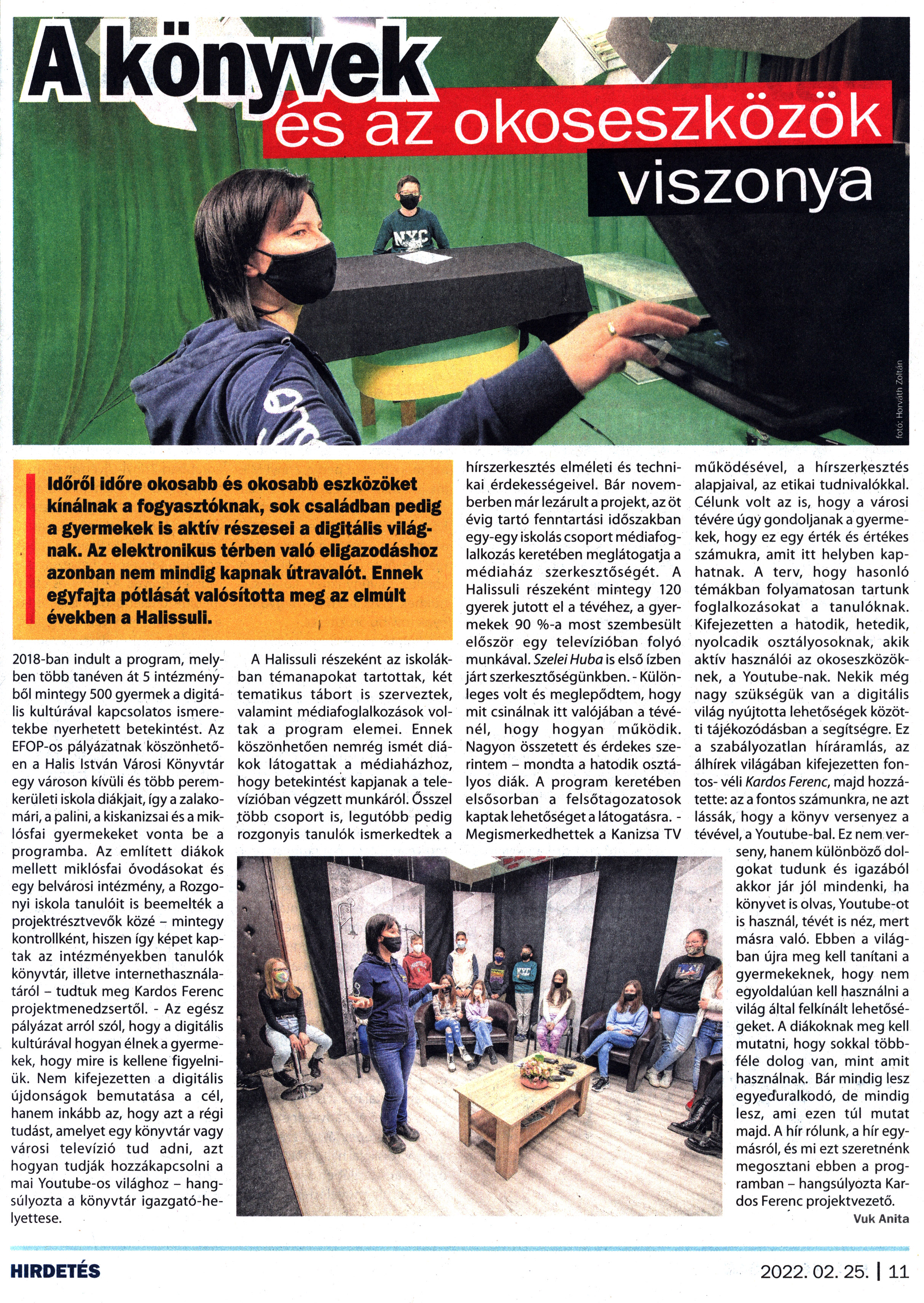 Nyilvános 1227 | 1697 | Kanizsa 2022. február 25. 4. szám 11. oldal | A könyvek és az okoseszközök viszonya Időről időre okosabb és okosabb eszközöket kínálnak a fogyasztóknak, sok családban pedig a gyermekek is aktív részesei a digitális világnak. Az elektronikus térben való eligazodáshoz azonban nem mindig kapnak útravalót. Ennek egyfajta pótlását valósította meg az elmúlt években a Halissuli. 2018-ban indult a program, melyben több tanéven át 5 intézményből mintegy 500 gyermek a digitális kultúrával kapcsolatos ismeretekbe nyerhetett betekintést. Az EFOP-os pályázatnak köszönhetően a Halis István Városi Könyvtár egy városon kívüli és több peremkerületi iskola diákjait, így a zalakomári, a palini, a kiskanizsai és a miklósfai gyermekeket vonta be a programba. Az említett diákok mellett miklósfai óvodásokat és egy belvárosi intézmény, a Rozgo-nyi iskola tanulóit is beemelték a projektrésztvevők közé - mintegy kontrollként, hiszen így képet kaptak az intézményekben tanulók könyvtár, illetve internethasználatáról - tudtuk meg Kardos Ferenc projektmenedzsertől. - Az egész pályázat arról szól, hogy a digitális kultúrával hogyan élnek a gyermekek, hogy mire is kellene figyelniük. Nem kifejezetten a digitális újdonságok bemutatása a cél, hanem inkább az, hogy azt a régi tudást, amelyet egy könyvtár vagy városi televízió tud adni, azt hogyan tudják hozzákapcsolni a mai Youtube-os világhoz - hangsúlyozta a könyvtár igazgató-helyettese. A Halissuli részeként az iskolákban témanapokat tartottak, két tematikus tábort is szerveztek, valamint médiafoglalkozások voltak a program elemei. Ennek köszönhetően nemrég ismét diákok látogattak a médiaházhoz, hogy betekintést kapjanak a televízióban végzett munkáról. Ősszel több csoport is, legutóbb pedig rozgonyis tanulók ismerkedtek a hírszerkesztés elméleti és technikai érdekességeivel. Bár novemberben már lezárult a projekt, az öt évig tartó fenntartási időszakban egy-egy iskolás csoport médiafoglalkozás keretében meglátogatja a médiaház szerkesztőségét. A Halissuli részeként mintegy 120 gyerek jutott el a tévéhez, a gyermekek 90 %-a most szembesült először egy televízióban folyó munkával. Szelei Huba is első ízben járt szerkesztőségünkben. - Különleges volt és meglepődtem, hogy mit csinálnak itt valójában a tévénél, hogy hogyan működik. Nagyon összetett és érdekes szerintem - mondta a hatodik osztályos diák. A program keretében elsősorban a felsőtagozatosok kaptak lehetőséget a látogatásra. -Megismerkedhettek a Kanizsa TV működésével, a hírszerkesztés alapjaival, az etikai tudnivalókkal. Célunk volt az is, hogy a városi tévére úgy gondoljanak a gyermekek, hogy ez egy érték és értékes számukra, amit itt helyben kaphatnak. A terv, hogy hasonló témákban folyamatosan tartunk foglalkozásokat a tanulóknak. Kifejezetten a hatodik, hetedik, nyolcadik osztályosoknak, akik aktív használói az okoseszközöknek, a Youtube-nak. Nekik még nagy szükségük van a digitális világ nyújtotta lehetőségek közötti tájékozódásban a segítségre. Ez a szabályozatlan híráramlás, az álhírek világában kifejezetten fontos- véli Kardos Ferenc, majd hozzátette: az a fontos számunkra, ne azt lássák, hogy a könyv versenyez a tévével, a Youtube-bal. Ez nem verseny, hanem különböző dolgokat tudunk és igazából akkor jár jól mindenki, ha könyvet is olvas, Youtube-ot is használ, tévét is néz, mert másra való. Ebben a világban újra meg kell tanítani a gyermekeknek, hogy nem egyoldalúan kell használni a világ által felkínált lehetőségeket. A diákoknak meg kell mutatni, hogy sokkal többféle dolog van, mint amit használnak. Bár mindig lesz egyeduralkodó, de mindig lesz, ami ezen túl mutat majd. A hír rólunk, a hír egymásról, és mi ezt szeretnénk megosztani ebben a programban - hangsúlyozta Kardos Ferenc projektvezető. Vuk Anita |