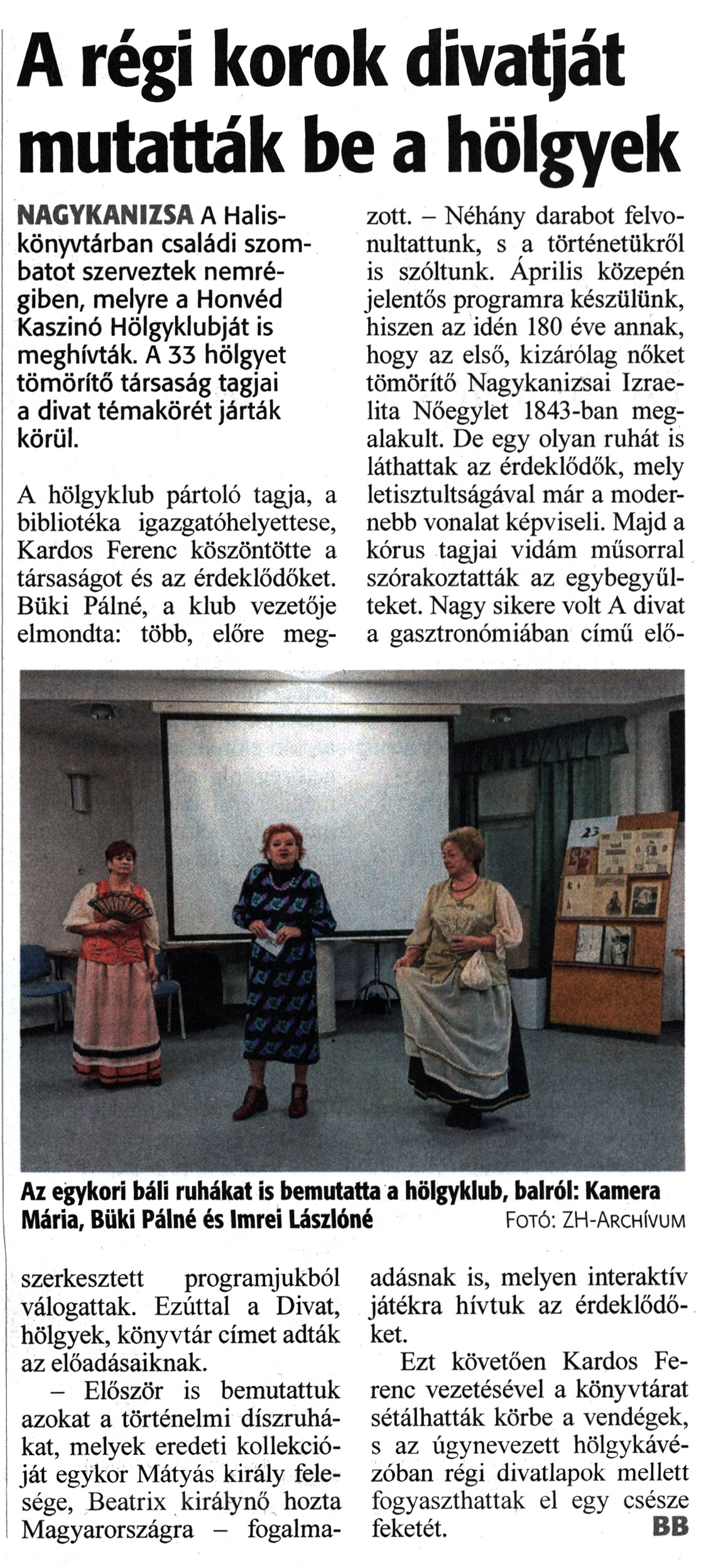 Nyilvános 1004 | 1304 | Zalai Hírlap 2023. február 16. 40. szám 6. oldal | A régi korok divatját mutatták be a hölgyek NAGYKANIZSA A Halis-könyvtárban családi szombatot szerveztek nemrégiben, melyre a Honvéd Kaszinó Hölgyklubját is meghívták. A 33 hölgyet tömörítő társaság tagjai a divat témakörét járták körül. A hölgyklub pártoló tagja, a bibliotéka igazgatóhelyettese, Kardos Ferenc köszöntötte a társaságot és az érdeklődőket. Büki Pálné, a klub vezetője elmondta: több, előre megszerkesztett programjukból válogattak. Ezúttal a Divat, hölgyek, könyvtár címet adták az előadásaiknak. - Először is bemutattuk azokat a történelmi díszruhákat, melyek eredeti kollekcióját egykor Mátyás király felesége, Beatrix királynő hozta Magyarországra - fogalmazott. - Néhány darabot felvonultattunk, s a történetükről is szóltunk. Április közepén jelentős programra készülünk, hiszen az idén 180 éve annak, hogy az első, kizárólag nőket tömörítő Nagykanizsai Izraelita Nőegylet 1843-ban megalakult. De egy olyan ruhát is láthattak az érdeklődők, mely letisztultságával már a modernebb vonalat képviseli. Majd a kórus tagjai vidám műsorral szórakoztatták az egybegyűlteket. Nagy sikere volt A divat a gasztronómiában című előadásnak is, melyen interaktív játékra hívtuk az érdeklődőket. Ezt követően Kardos Ferenc vezetésével a könyvtárat sétálhatták körbe a vendégek, s az úgynevezett hölgykávézóban régi divatlapok mellett fogyaszthattak el egy csésze feketét. BB Az egykori báli ruhákat is bemutatta a hölgyklub, balról: Kamera Mária, Büki Pálné és Imrei Lászlóné Fotó: ZH-Archívum |
