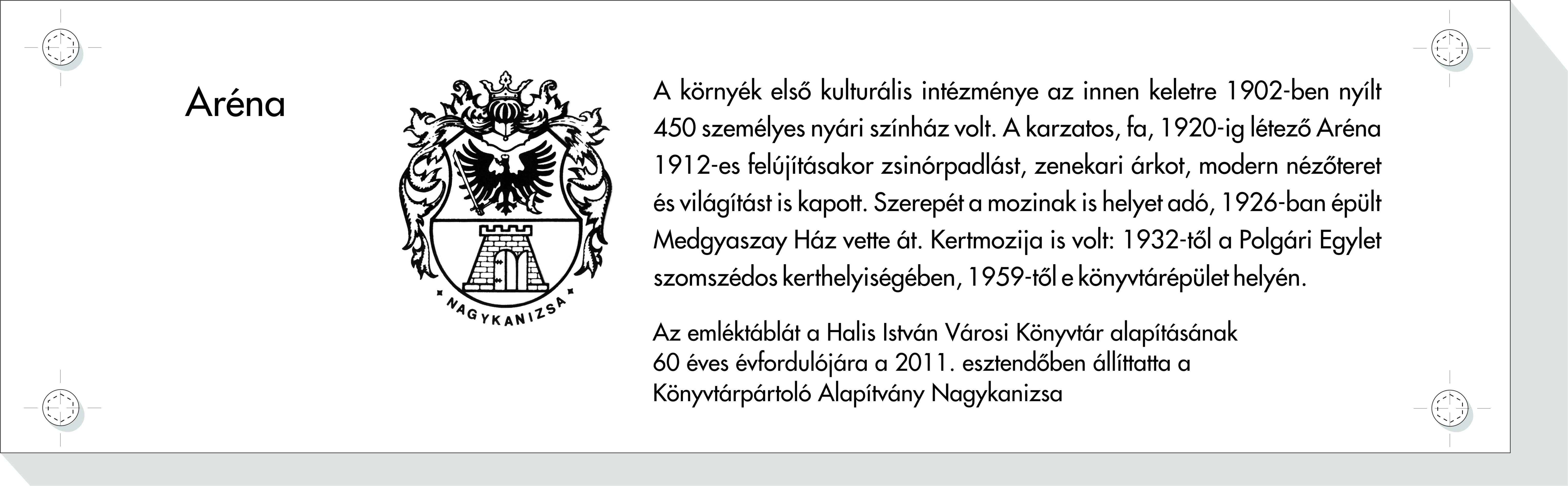 Nyilvános 1740 | 4406 | Aréna | A környék első kulturális intézménye az innen keletre 1902-ben nyílt 450 személyes nyári színház volt. A karzatos, fa, 1920-ig létező Aréna 1912-es felújításakor zsinórpadlást, zenekari árkot, modern nézőteret és világítást is kapott. Szerepét a mozinak is helyet adó, 1926-ban épült Medgyaszay Ház vette át. Kertmozija is volt: 1932-től a Polgári Egylet szomszédos kerthelyiségében, 1959-től e könyvtárépület helyén. Az emléktáblát a Halis István Városi Könyvtár alapításának 60 éves évfordulójára a 2011. esztendőben állíttatta a Könyvtárpártoló Alapítvány Nagykanizsa |