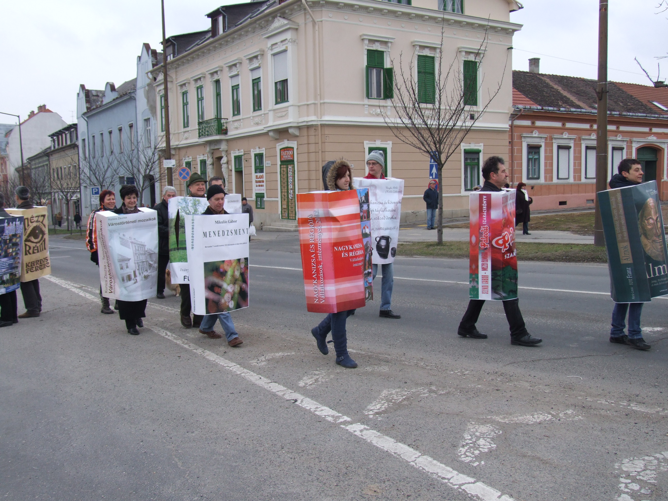 Nyilvános 918 | 1212 | 2013. február 9. A farsangi fánkfesztiválra készülve felhívásban kértük olvasóinkat, hogy öltsék magukra kedves könyvüket. Egy „könyvespolcnyi” jelentkező vette magára kedves olvasmányát, az ő vonulásukról készültek ezek a képek. A környezetükben néhol láthatók a Nagykanizsai Gólyalábasok, akik szintén a könyvtárhoz kötődnek. A „felvonuló kötetek” a könyvtár épületében még megtekinthetők. | |